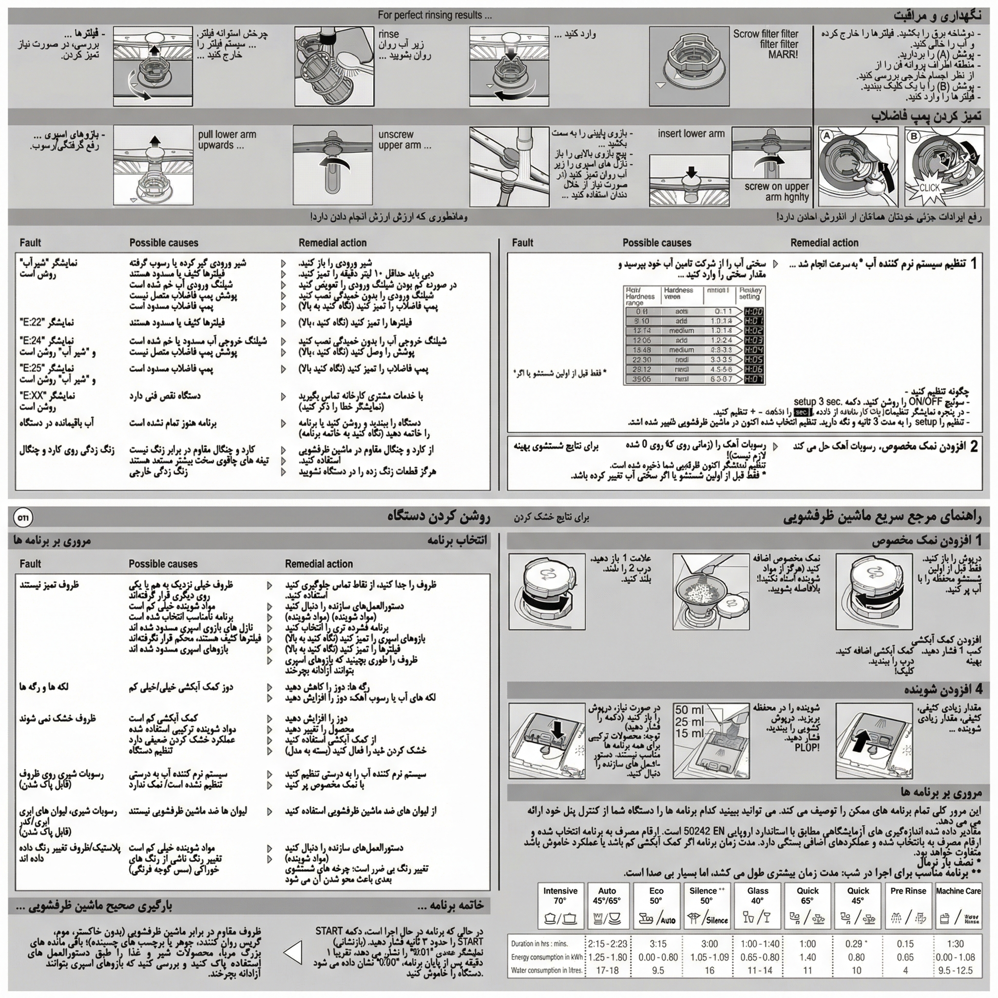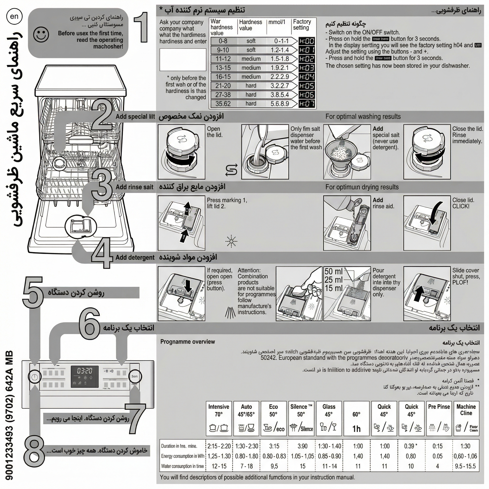 مقادیر مصرف آب و انرژی بسته به میزان کثیفی ظروف، تعداد ظروف، دمای آب ورودی و تنظیمات انتخابی ممکن است متغیر باشد.